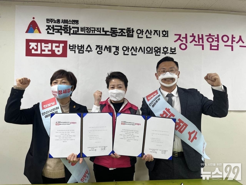 전국학교비정규직노동조합 안산지회(지회장 황순화)와 박범수(가 선거구)ㆍ정세경(마 선거구) 진보당 안산시의원 후보가 5일 정책협약식을 가졌다.