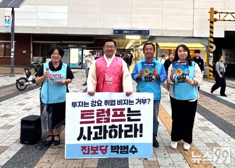 진보당 안산시 상록구 위원회(위원장 박범수)는 추석 명절을 앞둔 2025년 10월 1일 오후 5시 상록수역 앞에서 ‘트럼프 미국대통령은 사과하라, 트럼트 대통령의 약탈적 요구에 당당히 맞서겠다’며 정당연설회와 한가위 인사를 진행하였다.